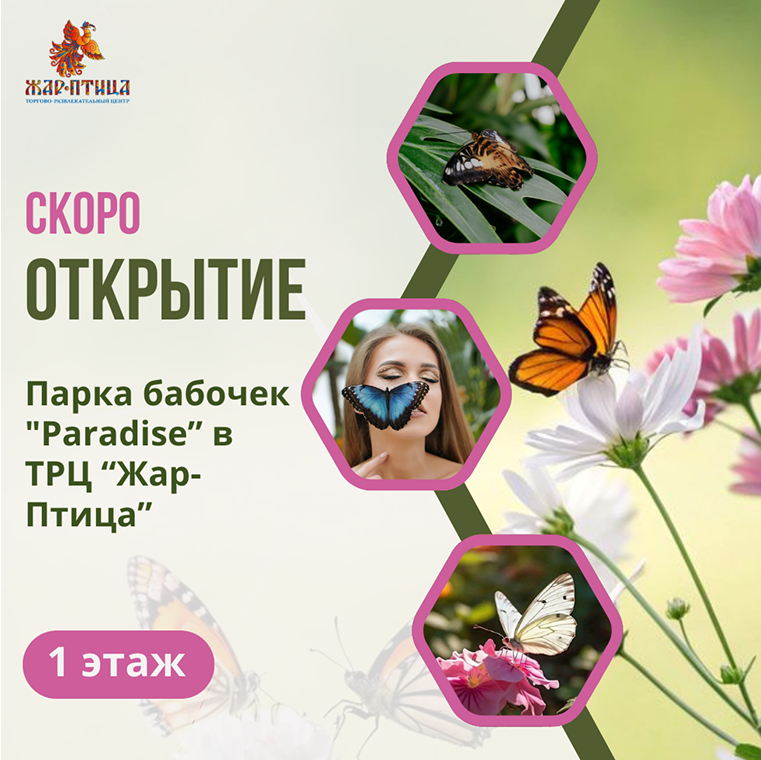 На 1 этаже ТРЦ "Жар-Птица" вас ждет открытие волшебного парка бабочек "Paradise.