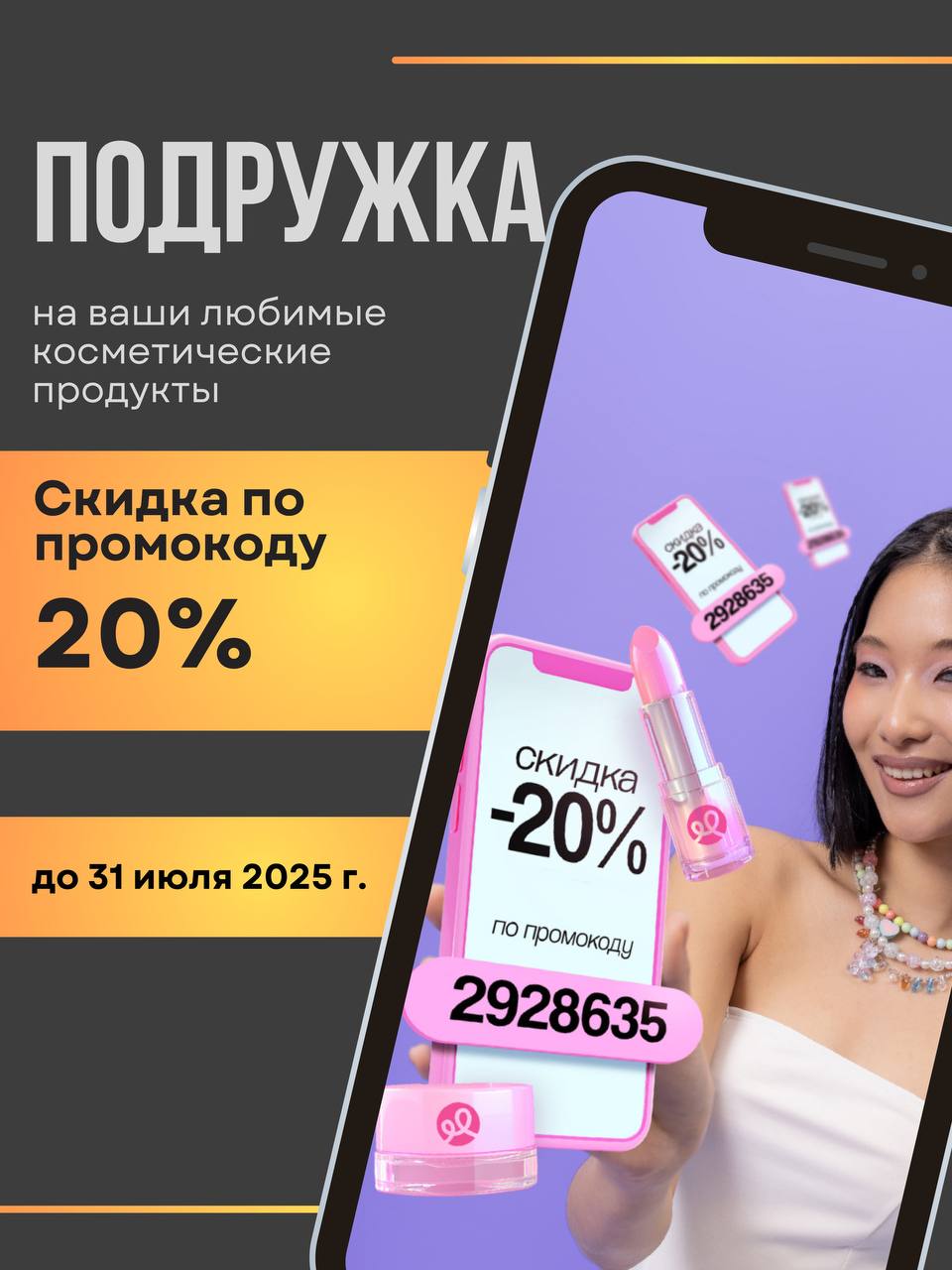 Подружка дарит промокод 2928635 на скидку 20% весь день и +5% до 12:00 в любой день. Промокод действует только в нашем торговом центре. Акция действует до 31 июля 2025 года