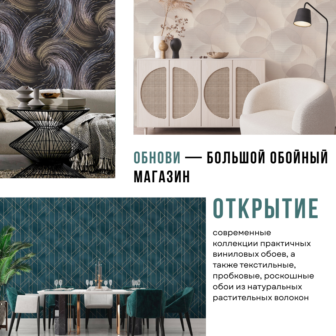 ОБНОВИ — большой обойный магазин. Для вас современные коллекции практичных виниловых обоев, а также текстильные, пробковые, роскошные обои из натуральных растительных волокон.